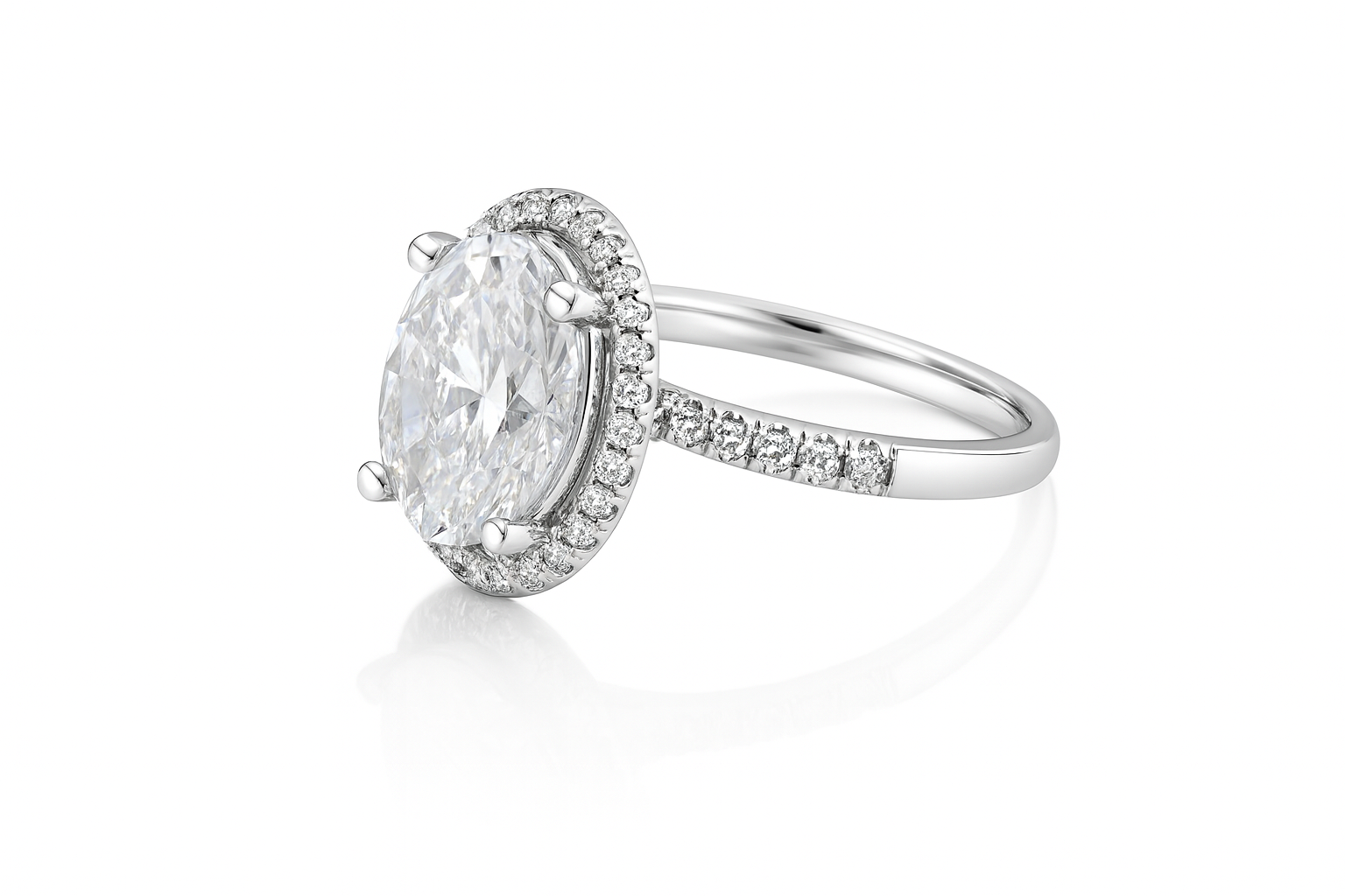 Say "yes" to this breathtaking 14kt white gold engagement ring that's ready to steal the show. A magnificent 4.00 carat lab-grown oval diamond commands attention at the center and a beautiful halo of round brilliant diamonds amplifies the sparkle.
