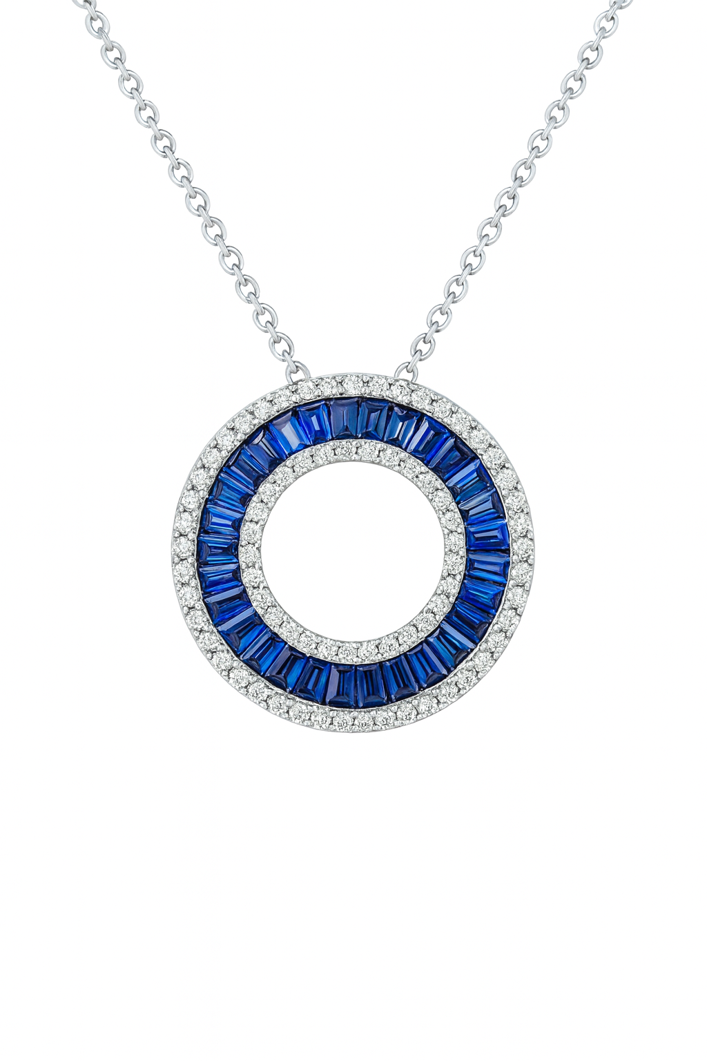 Crafted in 14kt white gold, this Baguette Blue Sapphire Disc Pendant showcases a refined design with channel set tapered baguette sapphires that bring vibrant color and depth. Prong set round brilliant cut diamonds accent the piece, adding exceptional sparkle and enhancing its elegant allure.