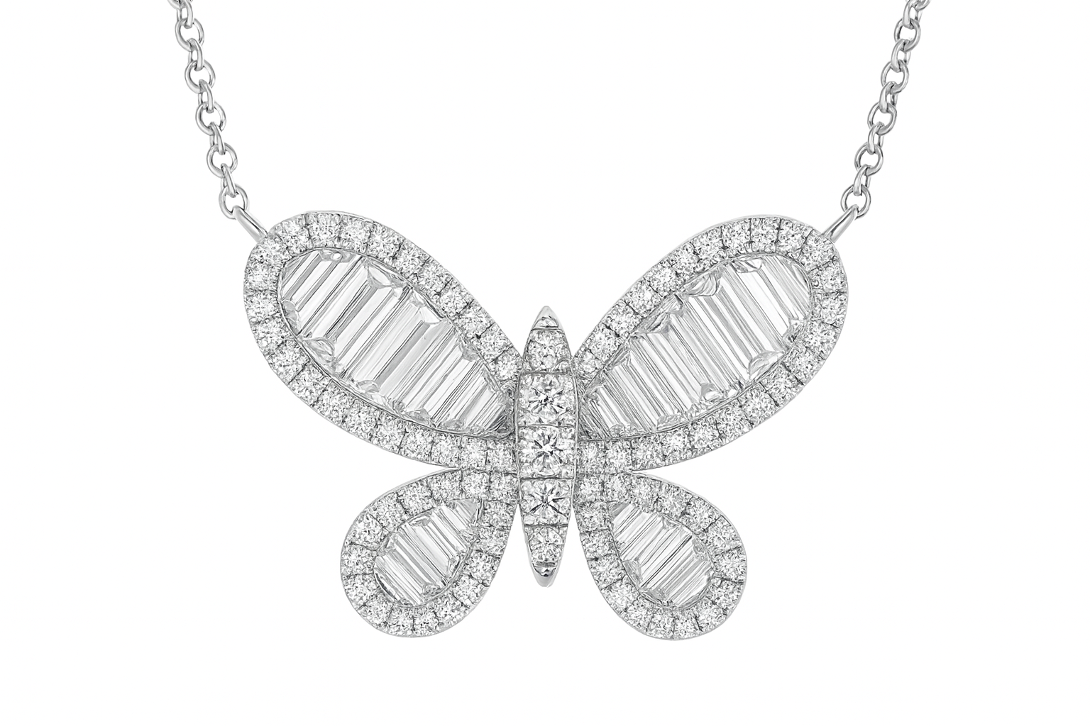 Crafted in 14kt white gold, this Baguette Butterfly Pendant showcases 1.88 carats of meticulously channel set baguette diamonds complemented by prong set round brilliant cut diamonds. The elegant butterfly design is suspended from an 18-inch 14kt white gold cable chain.