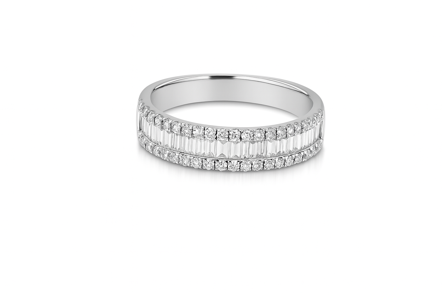Elevate your ring game with this beautiful 14kt white gold band! Channel set baguette diamonds in the middle create a sleek, modern look, while prong set round brilliant diamonds frame the edges for maximum sparkle. The 4.65mm width gracefully tapers to 3.15mm, giving you a design that's bold yet wearable—perfect for stacking or standing alone.