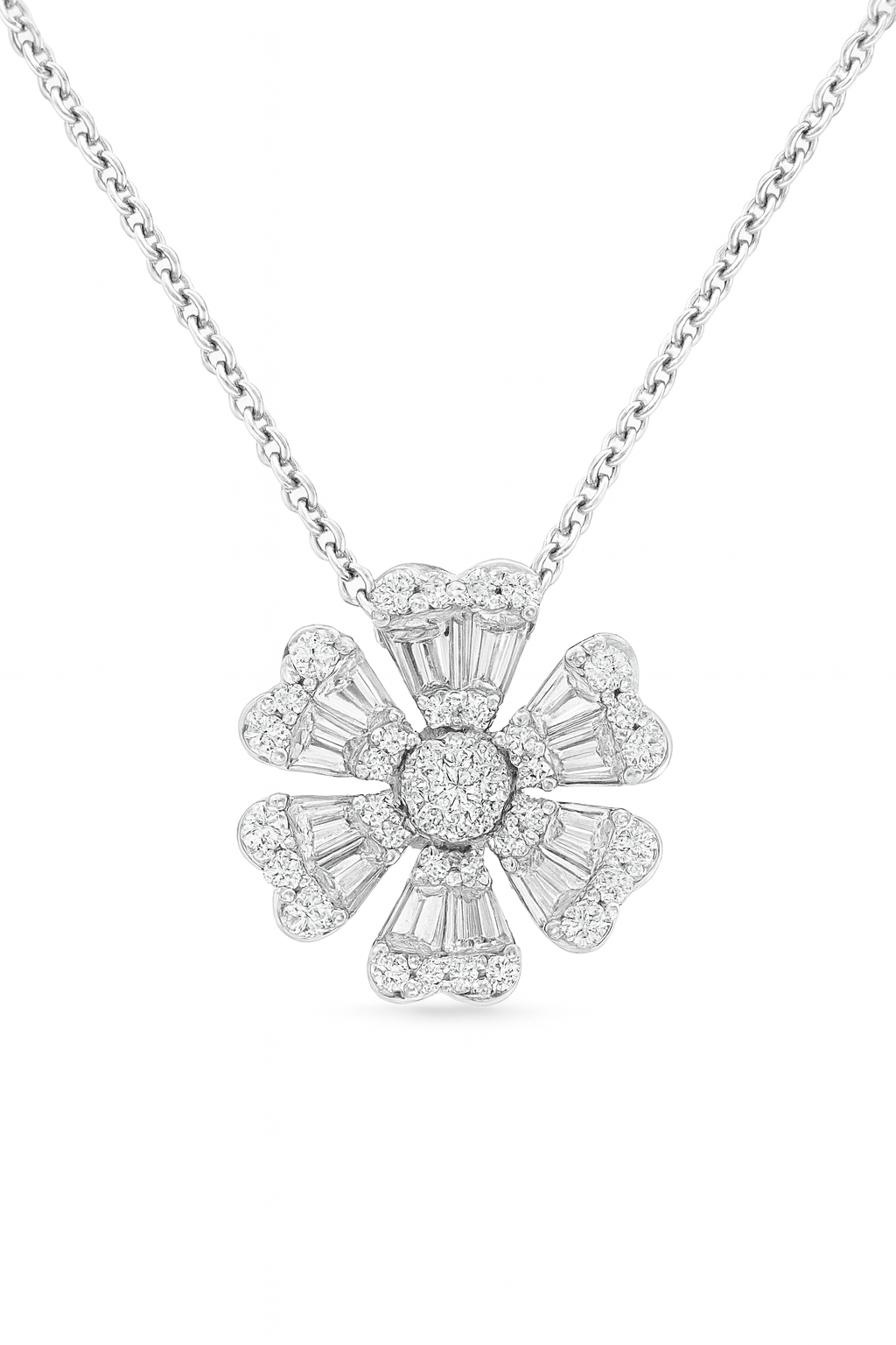 Crafted from 14kt white gold, this Baguette Flower Pendant showcases prong set tapered baguette diamonds complemented by sparkling round brilliant cut diamonds. Suspended from an 18" 14kt white gold cable chain, this pendant combines elegance with durability, making it a sophisticated addition to any jewelry collection.