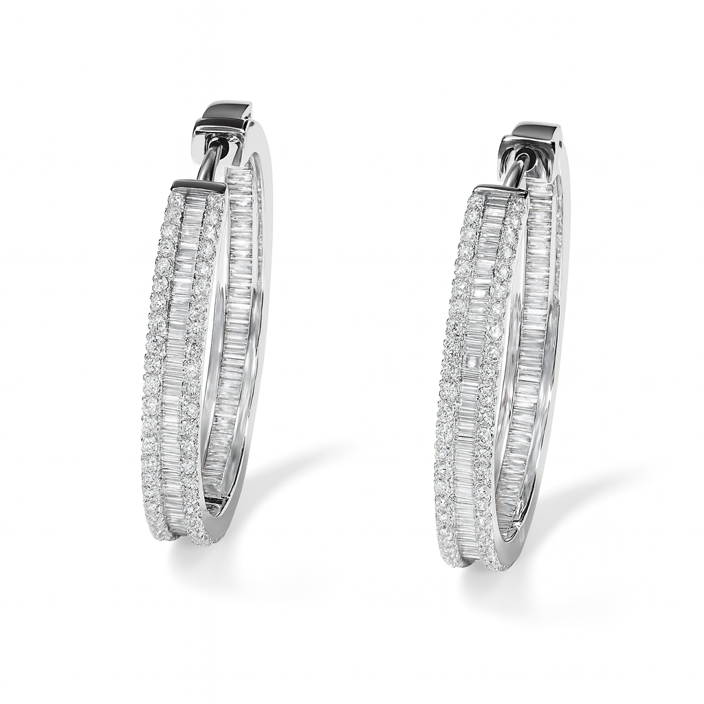 Experience timeless luxury with the Baguette In-Out Hoops crafted in 14kt white gold. These exquisite earrings showcase a radiant blend of channel-set baguette diamonds and prong-set round brilliant cut diamonds, totaling approximately 4.40 carats. Designed to catch the light from every angle, they add a dazzling touch of sophistication to any outfit, making them the perfect statement piece for your jewelry collection.