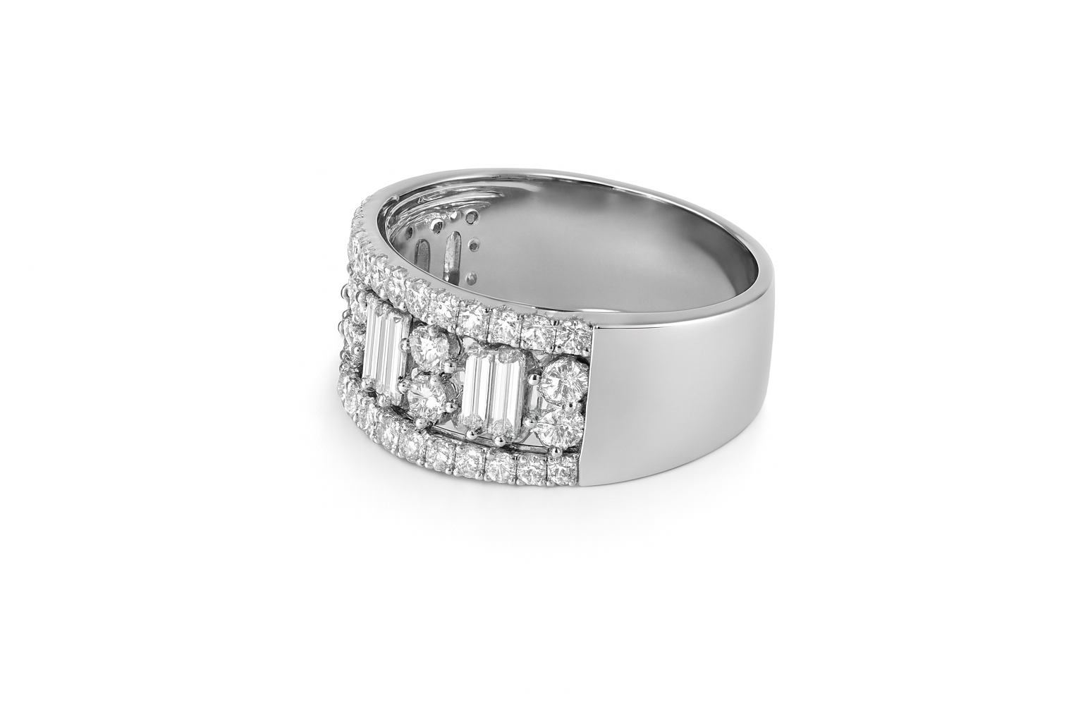 Crafted in 14kt white gold, this diamond baguette band features prong set round brilliant diamonds paired with straight baguette diamonds. Measuring 9.3mm wide at its broadest point, it tapers toward the bottom for a comfortable fit. The blend of brilliant and baguette cuts offers depth and elegance, making it an excellent choice for those who appreciate both classic sparkle and modern design in a versatile band.