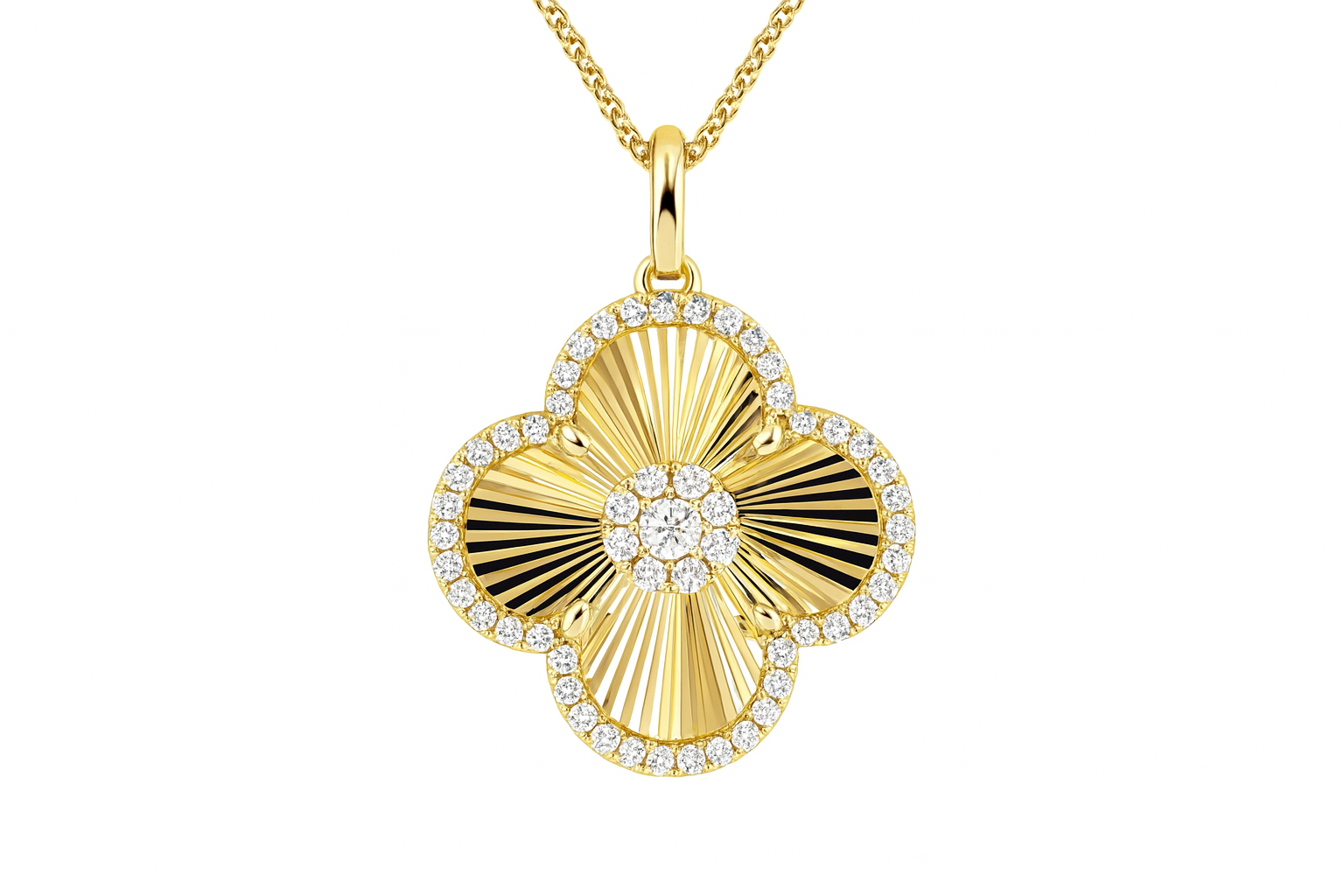 Bring a touch of sparkle and luck to your look with this charming Diamond Clover Necklace. Crafted in 14kt yellow gold, this delightful pendant features round brilliant diamonds strategically placed along the clover's edges and center, creating a dazzling display that catches every glimmer of light. Suspended from an 18" 14kt yellow gold cable chain, it's the perfect length for layering or wearing solo. Whether you're a diamond lover or simply drawn to four-leaf-clover symbolism, this piece adds personality and polish to any outfit.