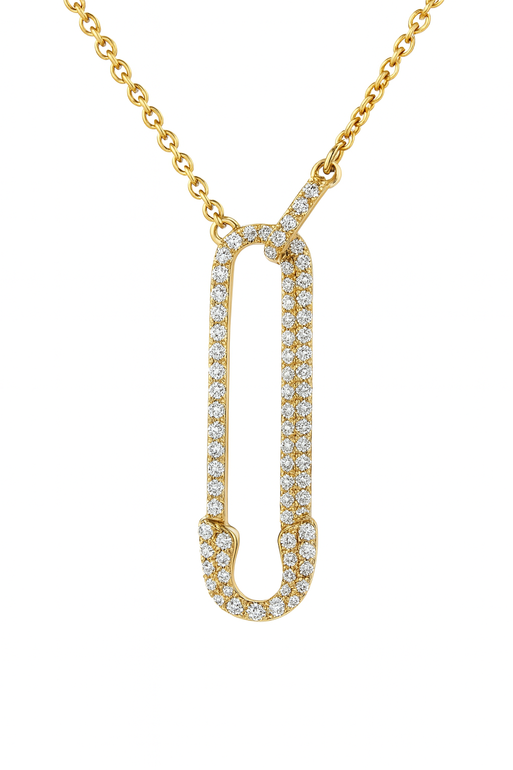 Add a touch of sparkle with this 14kt Yellow Gold Pave Diamond Safety Pin Pendant. Featuring beautiful round brilliant cut diamonds, this fun and chic accessory shines brightly on an 18" yellow gold cable chain.