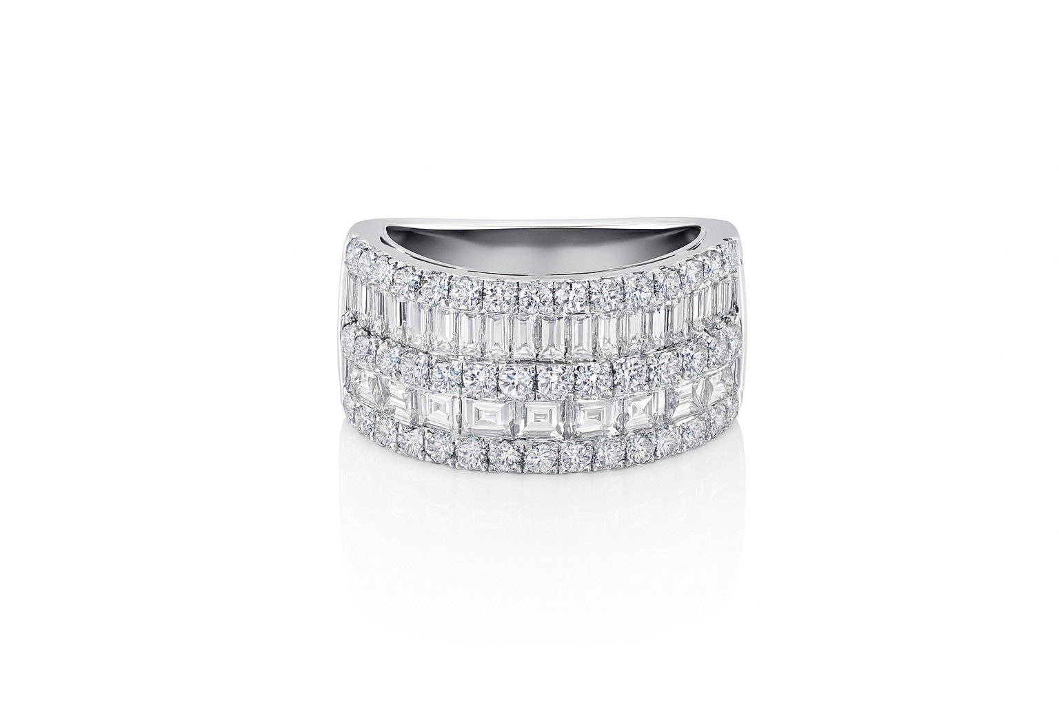 Elevate your elegance with this stunning 14kt white gold band, showcasing a captivating double row of channel set baguette and emerald cut diamonds. Framed by prong set round brilliant cut diamonds, this ring brilliantly combines timeless design with exquisite sparkle for a truly luxurious look.