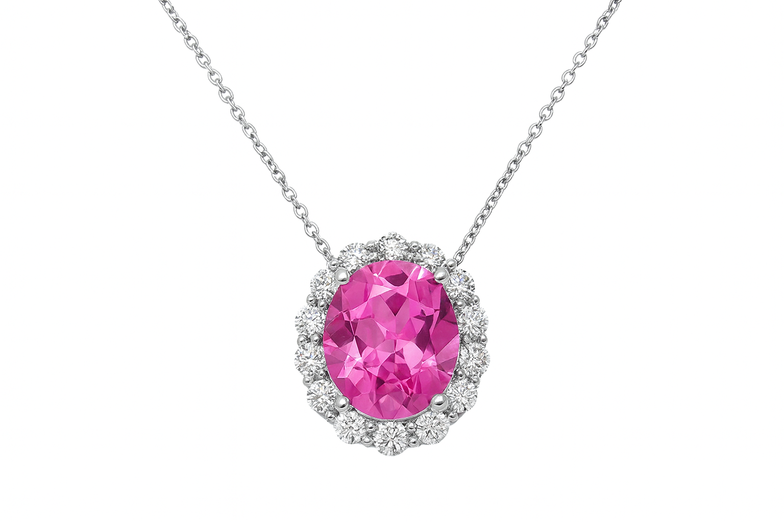 This expertly designed 14kt white gold pendant features an oval shaped pink topaz centerpiece, accented by a prong-set halo of round brilliant cut diamonds for refined brilliance. The pendant hangs gracefully from an 18-inch 14kt white gold cable chain, combining sophistication and durability in a piece ideal for elevating any ensemble.