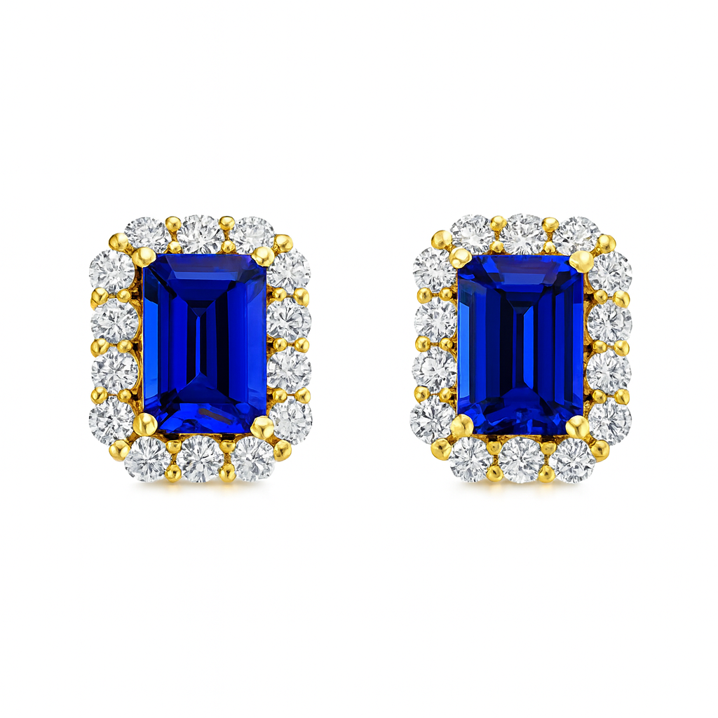 These 14kt yellow gold earrings feature prong set emerald cut tanzanite gemstones, each weighing approximately 1.00 carat. Surrounding the tanzanites, prong set round brilliant cut diamonds add exceptional sparkle and enhance the deep, vivid color of the stones. Crafted with precision, this pair combines classic elegance with expert design, making it an exquisite addition to any fine jewelry collection.